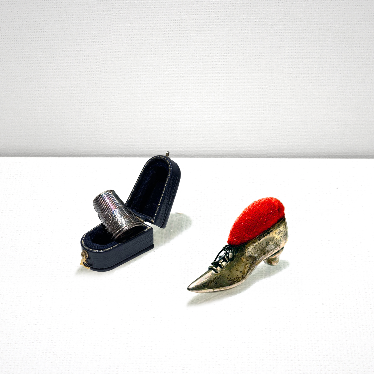 19世紀末に作られた皮革ケースに入った銀製シンブル(指ぬき)と、ブーツ型の銀製ピンクッションです。
