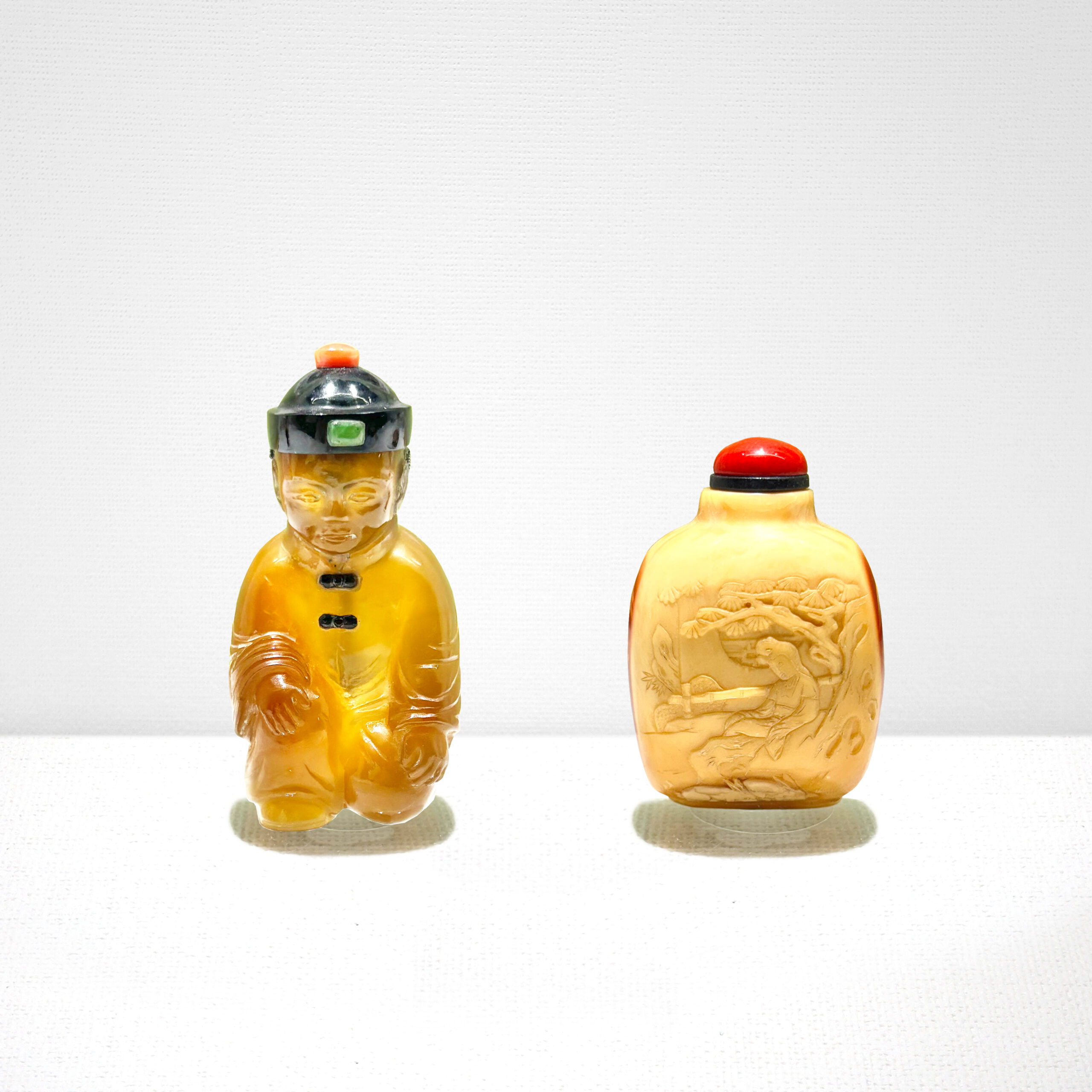 [ 左 ]中国服を着た少年を模したボトル [ 右 ]楽器を奏でる婦人が彫刻されたボトル 蓋部分に嗅ぎたばこの粉末をすくうための薬さじが取り付けられています。 作品詳細 製作年 19世紀末 製作地 中国 寸法 ( cm ) [ 左 ]H 6.5 [ 右 ]H 6.5 SHARE