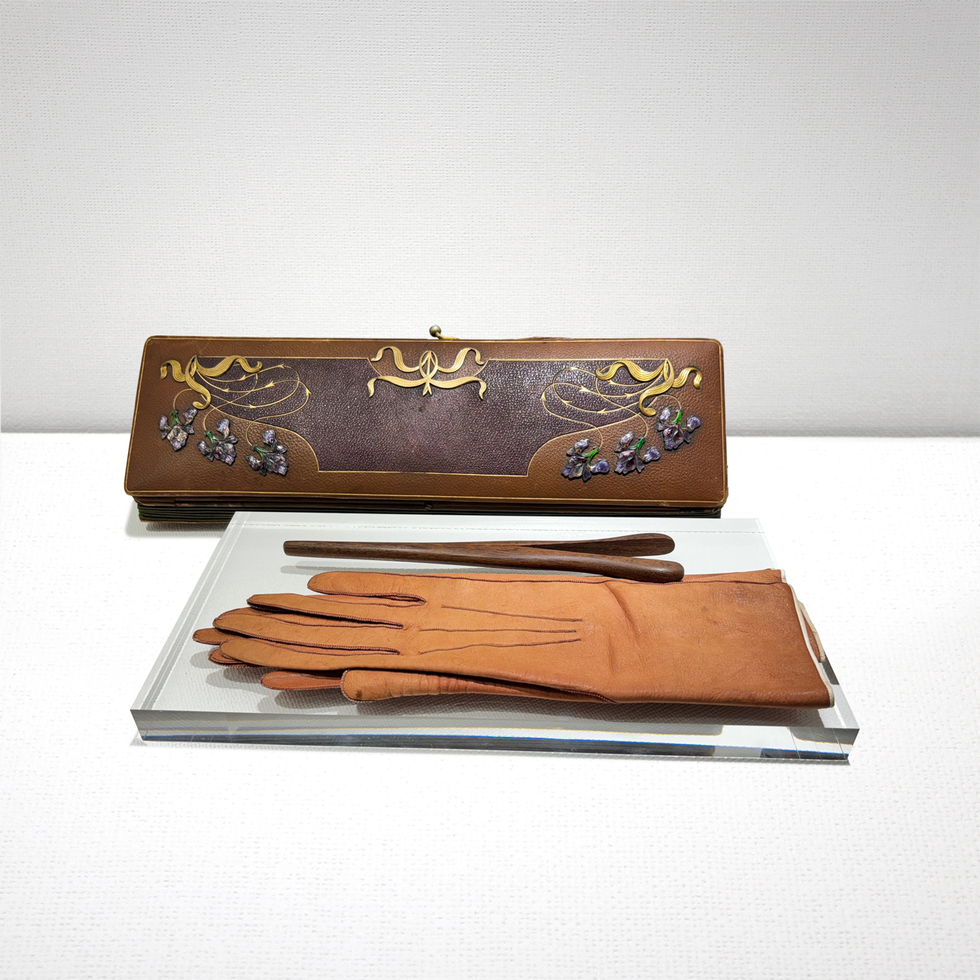 本革製の専用ケースには植物などの有機的なモチーフと、流れるようなリボンの自由曲線が特徴的な装飾が施されています。グローブは非常に華奢な為、装着の際の補助となる木製の工具が付属されています。