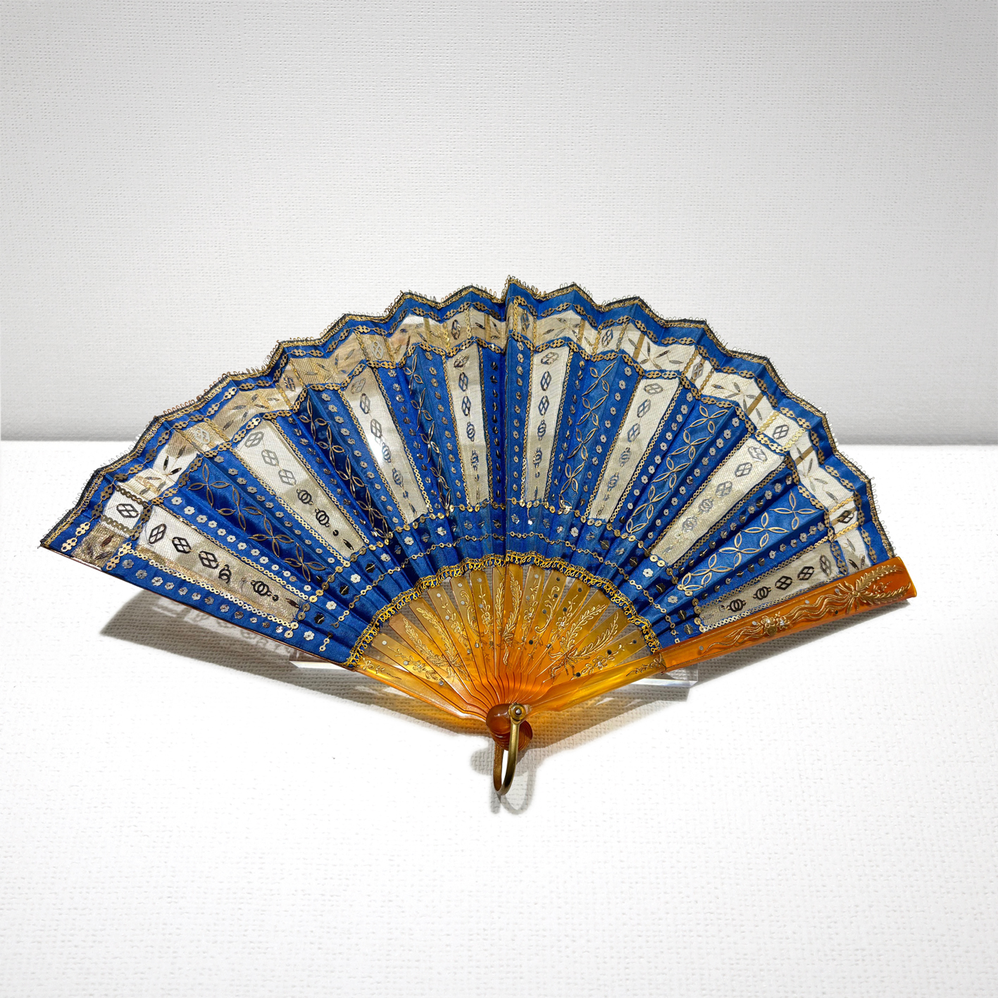 親骨と中骨部分にべっ甲が使われています。扇面には金属パーツで幾何柄模様の刺繍が施されています。