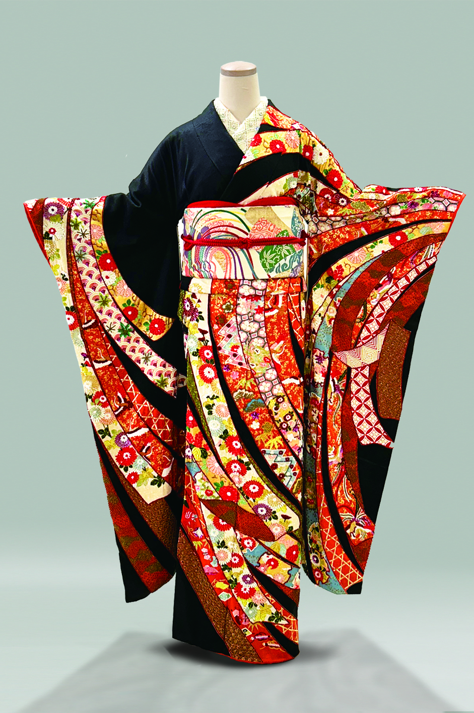 鳳凰、松竹梅、七宝、菊唐草、花菱亀甲紅葉など、 熨斗に配されたさまざまな吉祥文様に、 ビーズ、スパンコール、クリスタルで総刺繍を施し、 ダイナミックな柄行を豪華に印象づけた振袖。