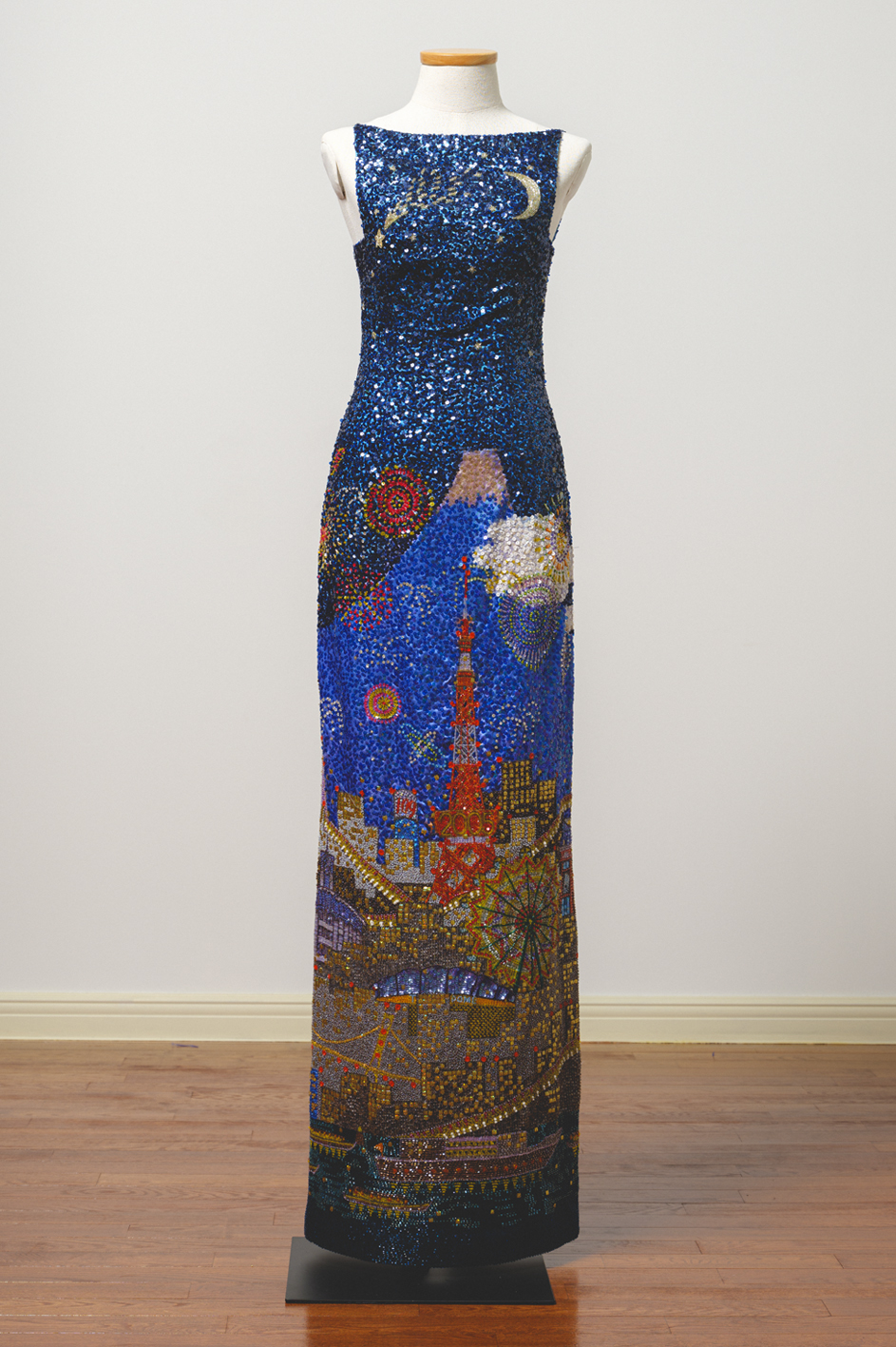 世界各国の夜景をイヴニングドレスにしました。様々な形のビーズ、スパンコール、クリスタルで夜の光の輝きを表現しています。