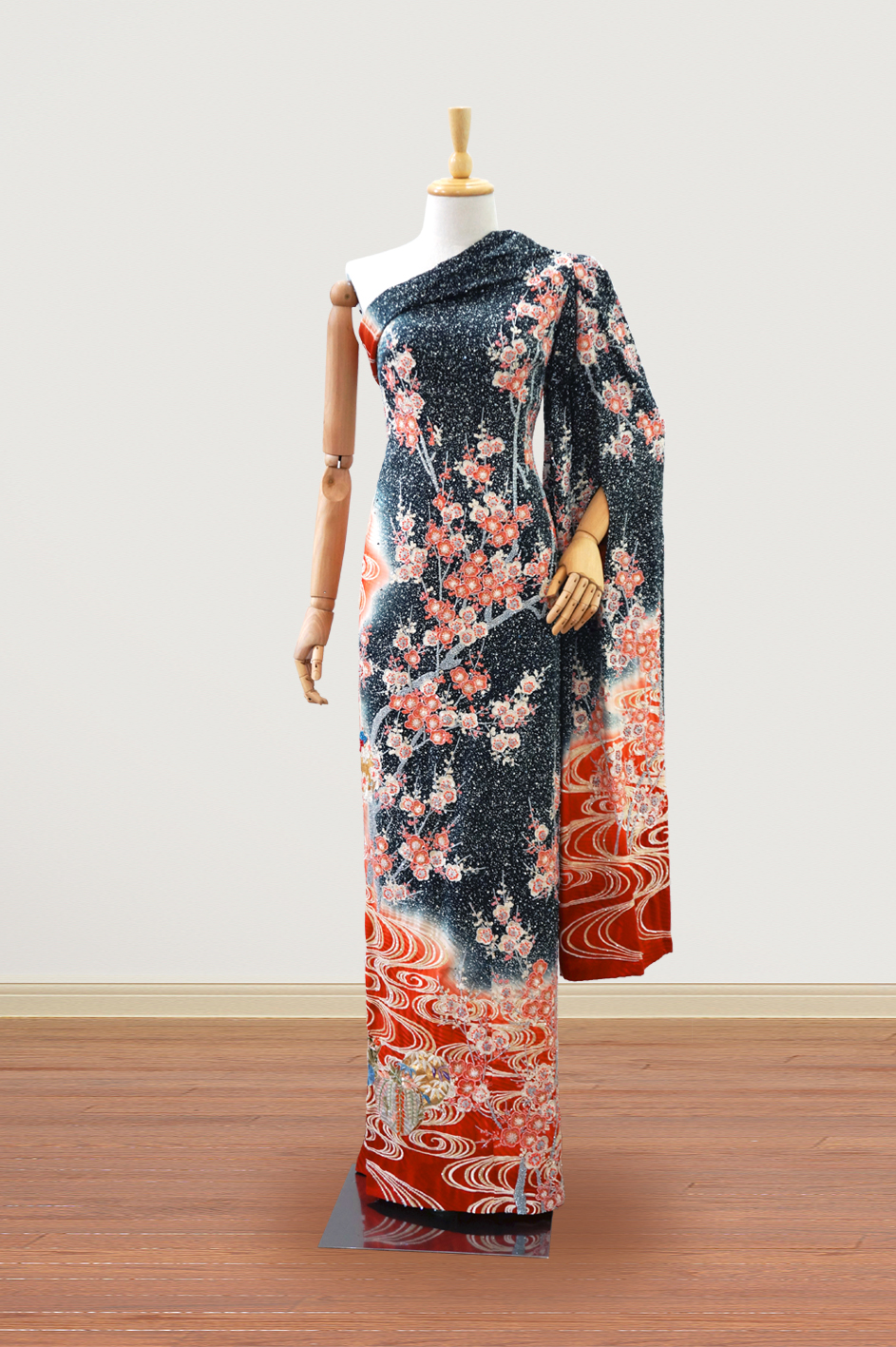 黒地に雪のような地模様と赤い流水のコントラストを活かしながら、全体的にビーズ刺繡を施し、振袖本来の美しさをさらに強調したドレス。 DR142 作品詳細 制作年 2004年11月 素材 絹 ( 着物 ) 刺繡材料 ビーズ、スパンコール SHARE