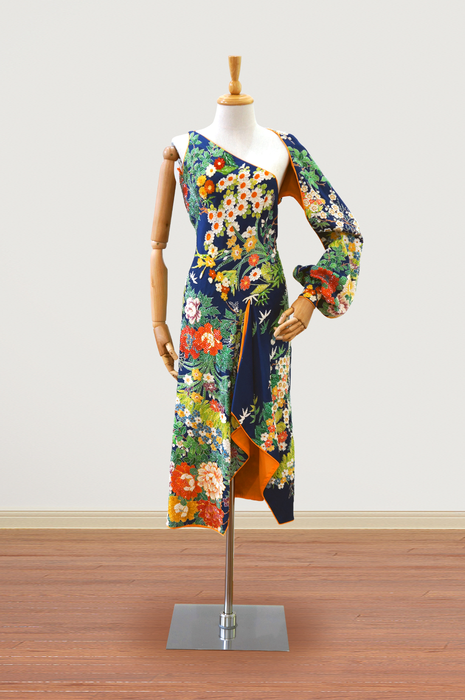 着物地の多彩な花模様を全てビーズの刺繍で仕上げたブルー地のドレス DR133 作品詳細 製作年 2001年 2012改作 素材 絹 ( 着物 ) 刺繍材料 ビーズ、スパンコール、コード、銀糸 SHARE