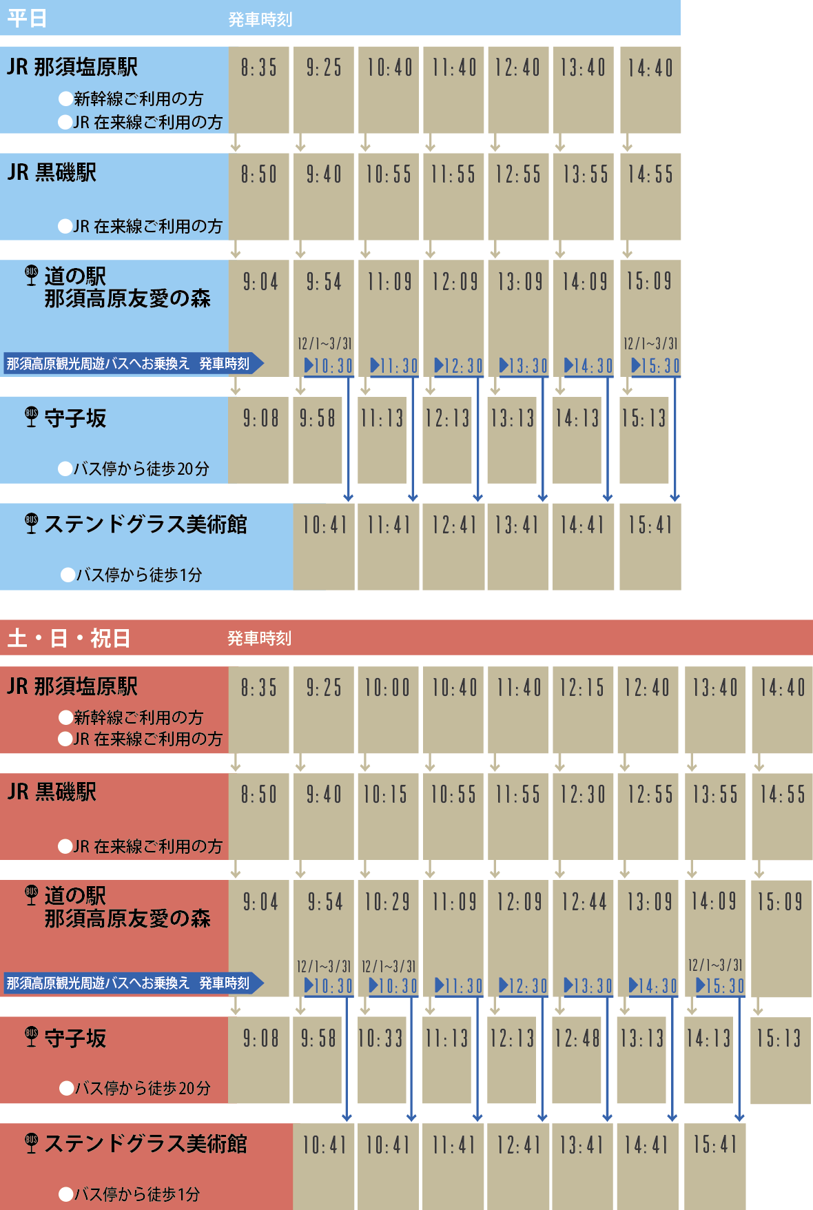 今回は最寄駅のJR那須塩原駅、JR黒磯駅から路線バスや周遊バスを利用してご来館される方へ時刻表のご案内です。
