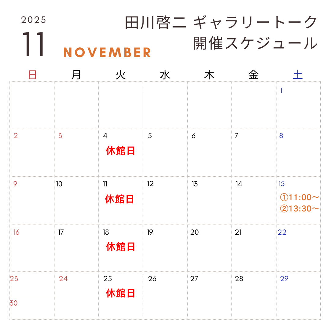 11月田川啓二ギャラリートーク開催スケジュールです。 皆様のご来館をお待ちしております♪ 田川啓二ギャラリートーク 開催日 11月15日(土) 時間 約40分~60分 《土曜日》 ①11:00~ ②13:30~ ※参加費無料 ※予約不要 参加をご希望の方は、開始5分前にホール展示場「オートクチュールビーズ刺繍ウォールアート」前にお集まりください。 SHARE