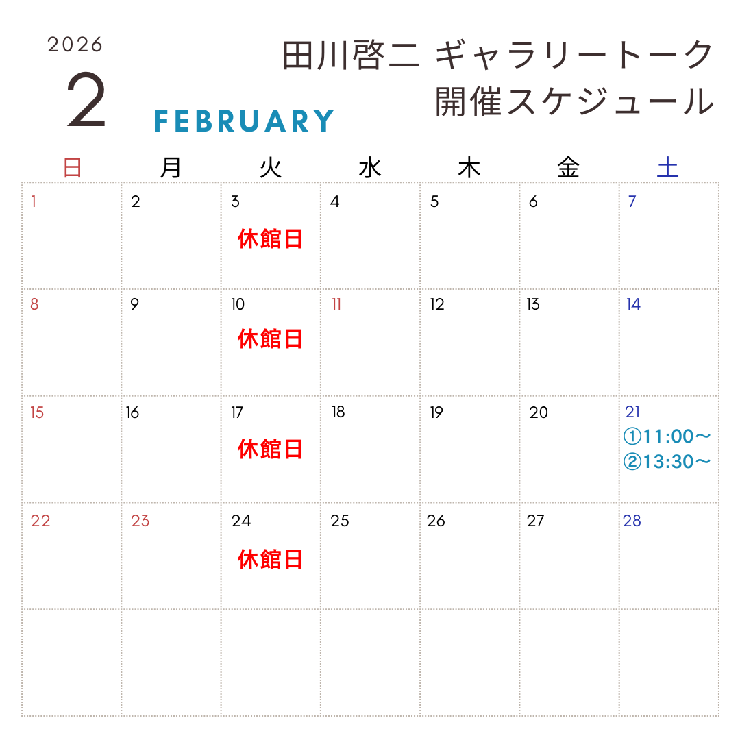 2月田川啓二ギャラリートーク開催スケジュールです。 皆様のご来館をお待ちしております♪ 田川啓二ギャラリートーク 開催日 2月21日(土) 時間 約40分~60分 《土曜日》 ①11:00~ ②13:30~ ※参加費無料 ※予約不要 参加をご希望の方は、開始5分前にホール展示場「オートクチュールビーズ刺繍ウォールアート」前にお集まりください。 SHARE