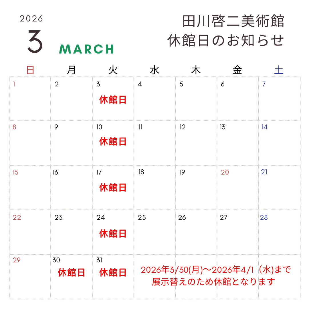 3月の休館日は 3日、10日、17日、24日、30日、31日 となります。