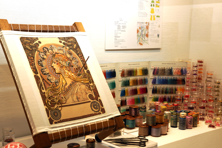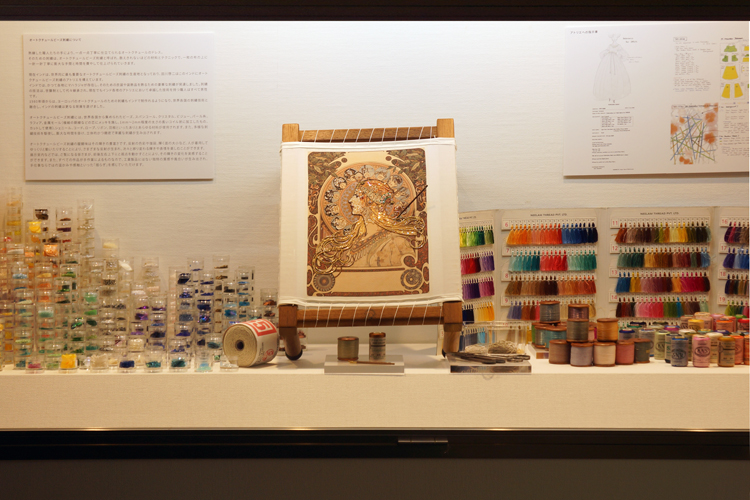 こちらでは、作業中の風景を中心に、さまざまな形のビーズやスパンコールなどの材料や、通常では見ることの出来ないデザイン画や仕様書などがパネル仕立てで展示されています。