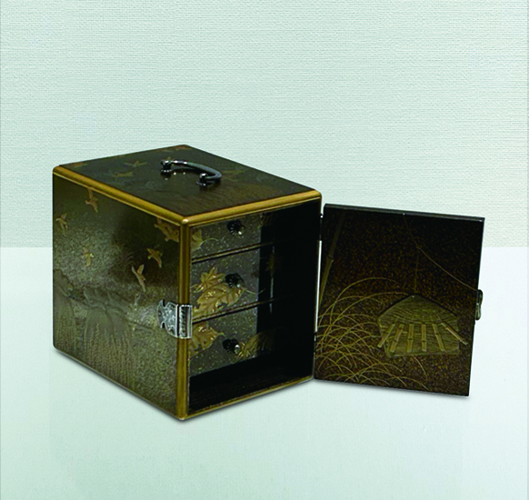 秋の収穫の時期を迎えた稲穂と、それに群がる雀、さらに鳥よけの鳴子が描かれています。雀は古くから「厄をついばむ」として、厄除けや一族繁栄の象徴とされ、想像上の生き物、鳳凰のヒナという言い伝えもあり、縁起の良いものとされています。