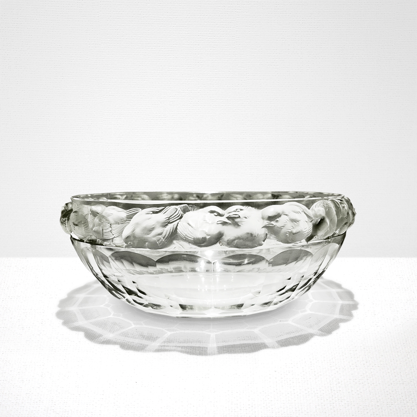 透明度の高いクリアガラスの縁部分に25羽の雀がぐるりと掘り込まれています。