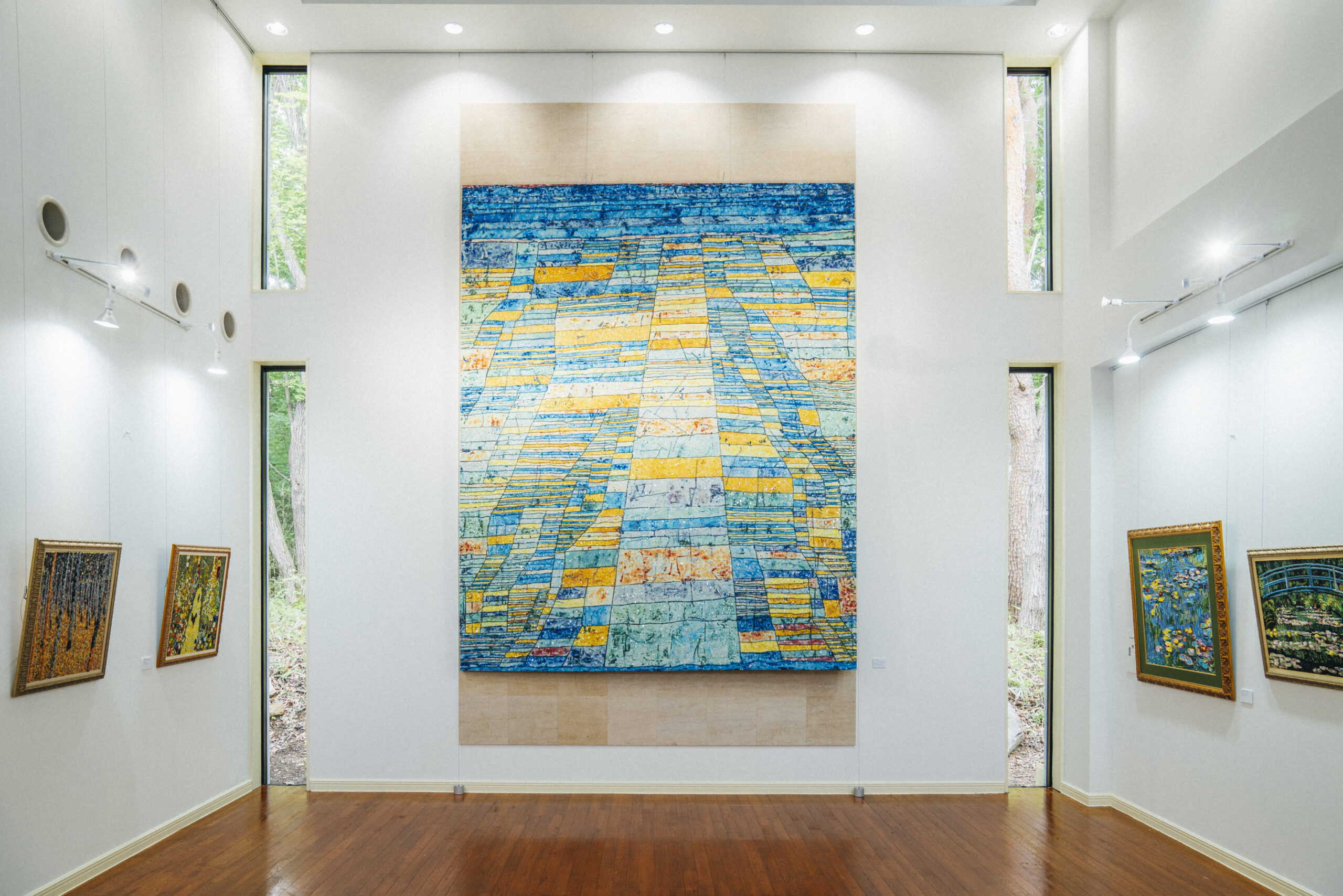 田川啓二美術館の開館にあわせ制作されたこのタペストリーは、原画の5倍近くに拡大された下絵に、ビーズとスパンコールで刺繍を施し完成しました。
