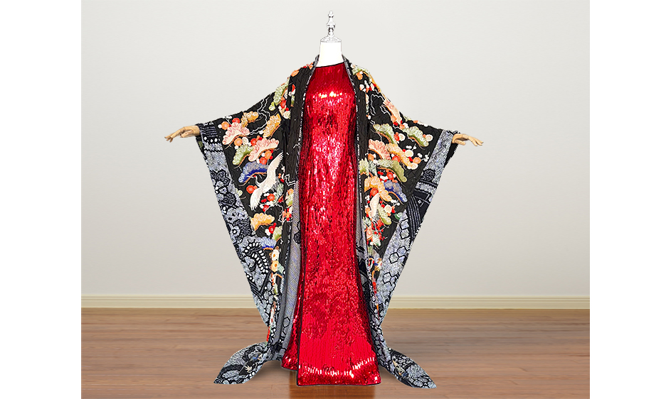 着物イヴニングガウンとレッドメタリックドレス