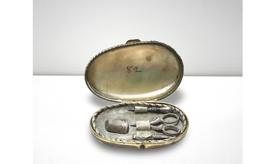 白蝶貝のケースに収められたミニチュアソーイングキット