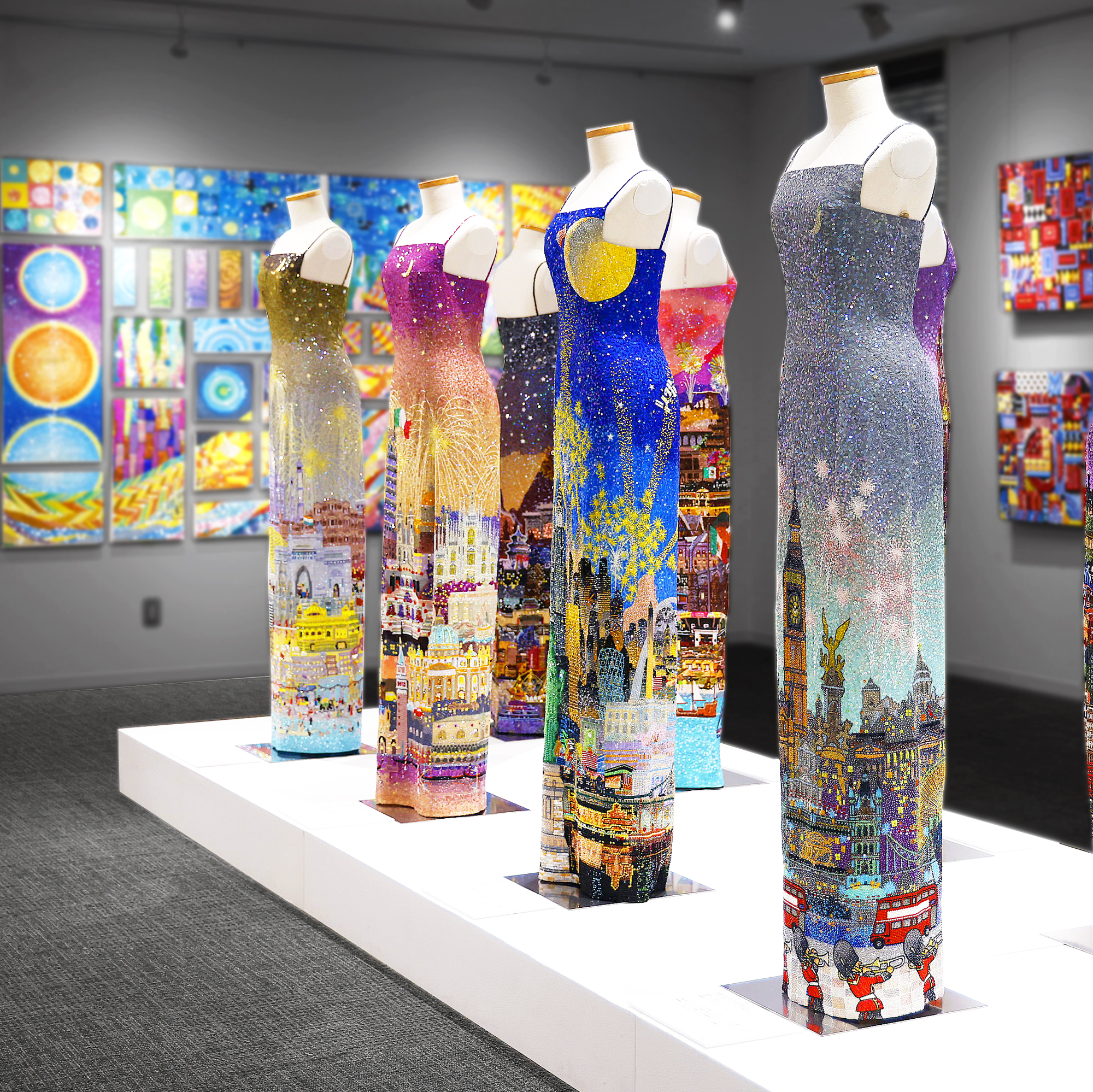 各国の夜景の輝きをビーズやスパンコールの刺繍で表現した《夜景ドレス》を展示。